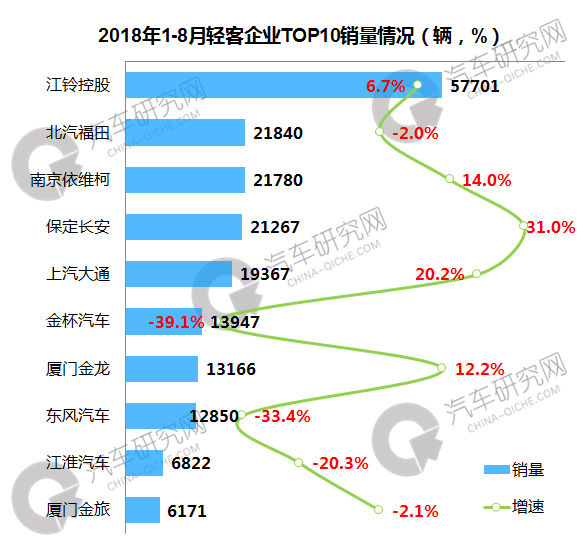 1-8月,轻客企业中,江铃控股位居第一,销量达到57701辆,同比增长6.7%;第二集团企业销量在2万辆左右,前十企业中,保定长安增幅最大,同比增长31.0%。