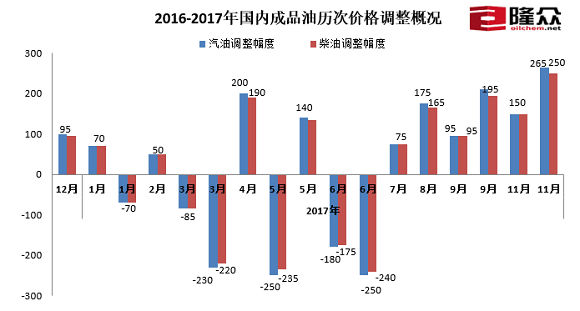 “11月17日0点将上调汽柴油限价,每吨汽油上调265、柴油上调250元,折合每升89#0.19、92#0.21、95#0.22、0#0.21元。”隆众资讯成品油分析师赵桂珍表示,本次调价是年内第十次上调,也创下今年年内最大涨幅。本次调价过后,2017年成品油调价将呈现“十涨六跌六搁浅”的格局。下一次调价窗口将在2017年11月30日24时开启。