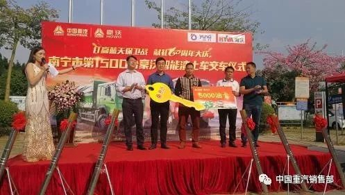 11月4日,为助力首府南宁城市建设,保卫碧水蓝天,同时为广西壮族自治区60周年大庆建设项目保驾护航,中国重汽在南宁市隆重举办“2018年南宁市第1500台豪沃智能渣土车交车暨亲人服务免费体检月启动仪式”。