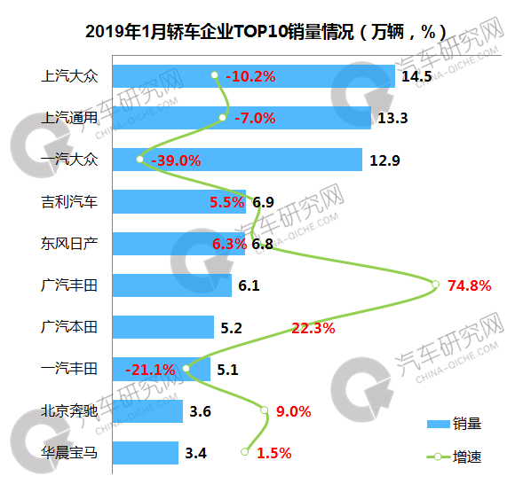 1月,乘用车产销分别完成199.5万辆和202.1万辆,比上月分别下降2.9%和9.5%,比上年同期分别下降14.4%和17.7%,增速低于汽车总体2.3和2个百分点。