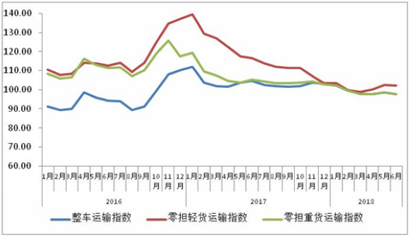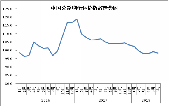 由中国物流与采购联合会和林安物流集团联合调查的中国公路物流运价指数2018年6月为98.5点,比上月回落0.74%,在连续两个月小幅回升后有所回调。