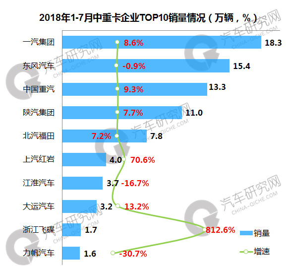 1-7月,中重卡前十企业中,一汽集团继续保持领先,累计销量达到18.3万辆,同比增长8.6%,东风汽车位居第二,累计销量达到15.4万辆,同比下滑0.9%;前十企业中,浙江飞碟增幅最大,同比增长812.6%。