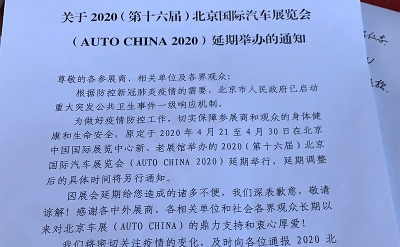 近日获悉,因抗击疫情需要,原定在2020年4月21至4月30日期间在北京中国国际展览中心新、老展馆举办的举办的2020(第十六届)北京国际汽车博览会将延期举办,具体举办时间另行通知。 [详细]
