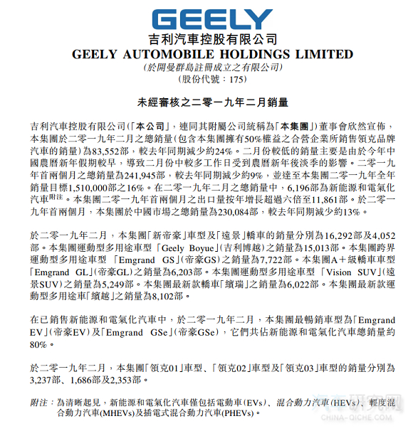 因新年假期吉利汽车2月销量为83552辆同期减少约24%