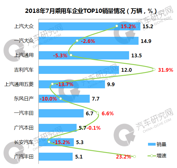 7月乘用车企业中,上汽大众位居第一,销量达到15.2万辆,同比增长15.2%;前十企业中,吉利汽车增幅最大,同比增长31.9%,销量为12万辆;长安汽车降幅最大,同比下滑15.2%。 [详细]