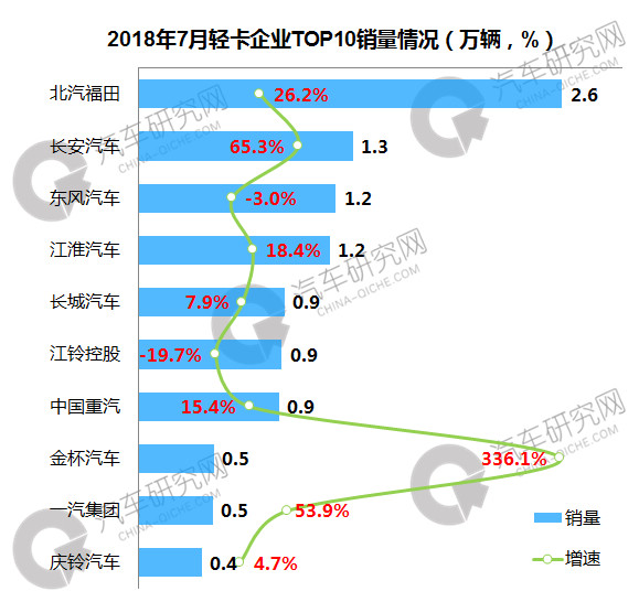 2018年7月轻卡企业:金杯汽车销量增速超过300%