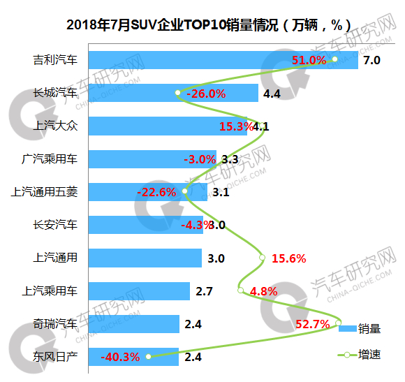7月SUV前十企业中,吉利汽车居于首位,销量达到7.0万辆,增幅达51.0%;前十企业中,奇瑞汽车增幅最大,同比增长52.7%,东风日产下滑较大,同比下滑40.3%,7月份仅销售2.4万辆。 [详细]