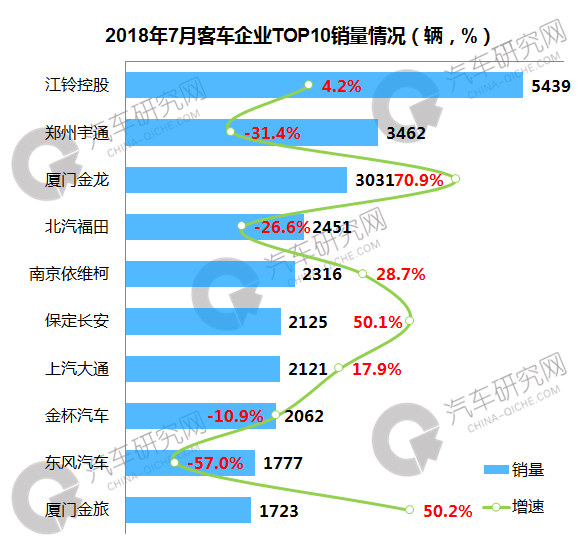 7月客车企业中,江铃控股位居第一,销量达到5439辆,同比增长4.2%;郑州宇通销量排名次席,同比则下降超过30%;前十企业中,厦门金龙和厦门金旅增幅相对较大,分别为70.9%和50.2%。 [详细]
