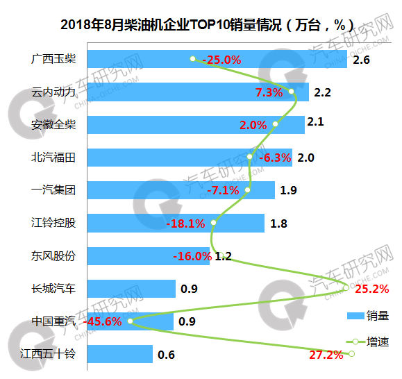 2018年8月柴油机企业:玉柴销售2.6万台 同比下滑25.0%