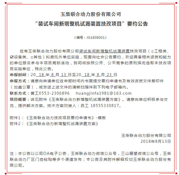 兹有玉柴联合动力股份有限公司装试车间新增整机试漏装置技改项目(□工程类、☑设备类、□其他)拟委托外单位实施,现面向社会公告要约,欢迎具备相关资质和能力的单位报名参与本项目竞标活动 [详细]