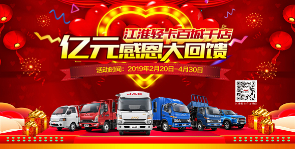 为答谢300万江淮轻卡客户一直以来的信赖,江淮轻卡将于2019年2月20日至4月30日,在全国范围内开展百城千店亿元感恩大回馈活动,八重大礼欢乐颂,8亿感恩大回馈,本次活动,江淮轻卡从产品促销、售后服务、金融政策等方面,为用户定制了价值八亿元的八重豪礼,深度聚焦用户在 [详细]