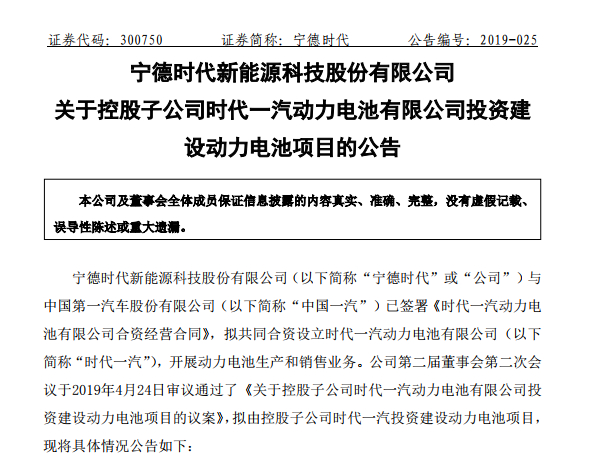 宁德时代携手中国一汽成立公司布局动力电池业务