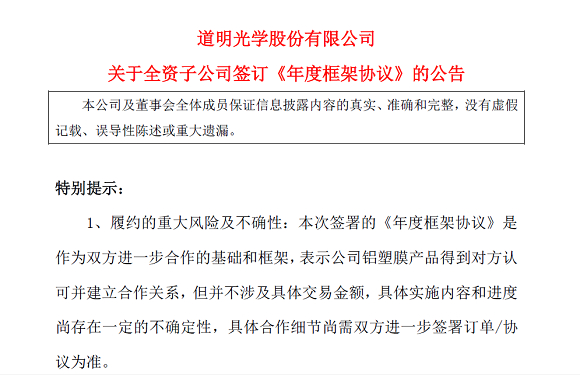 道明光学公告称,旗下全资子公司道明光电与天津力神签订《年度框架协议》,双方就公司铝塑膜产品合作达成了合作意向,双方将就具体合作事项进一步商谈约定。 [详细]