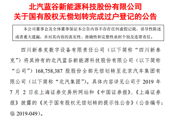 北汽蓝谷发布国有股权无偿划转完成过户登记公告