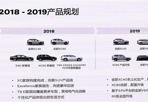 日前,沃尔沃官方发布了2018-2019年度在华产品规划。规划显示,沃尔沃在2018年内将完成进口XC40的投放,2019年度则有4款车型计划推出,包括全新V60/S60、国产XC40以及改款XC90等。 [详细]