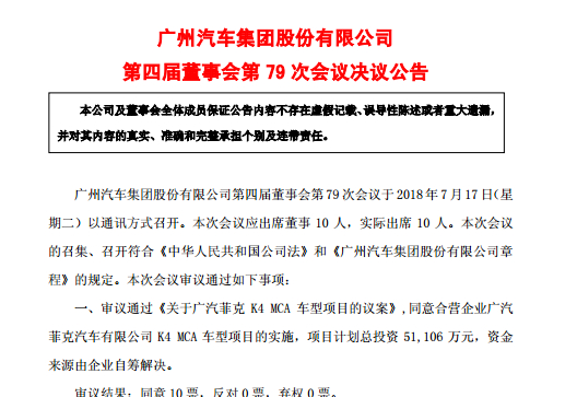 广汽集团公布,公司第四届董事会第79次会议召开,审议通过《关于广汽菲克K4 MCA车型项目的议案》,同意合营企业广汽菲克汽车有限公司K4 MCA车型项目的实施,项目计划总投资51106万元,资金来源由企业自筹解决。 [详细]