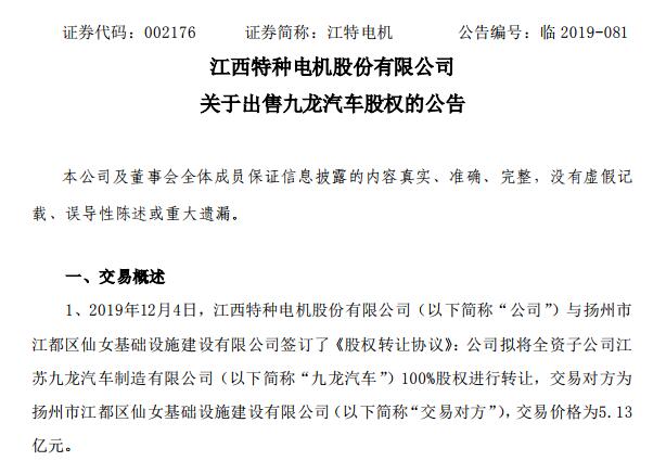 江特电机拟以5.31亿元出售子公司九龙汽车100%股权