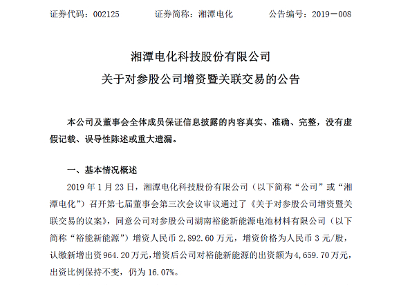 湘潭电化2892万加码电池材料