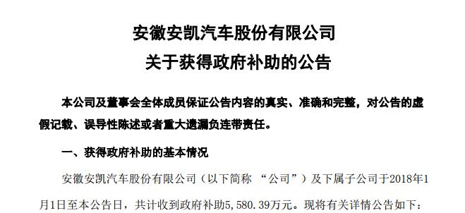 安凯汽车获得政府补助5580.39万元