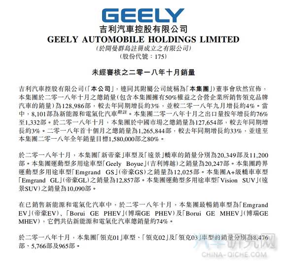 吉利汽车10月销量增长3% 全年目前完成80%