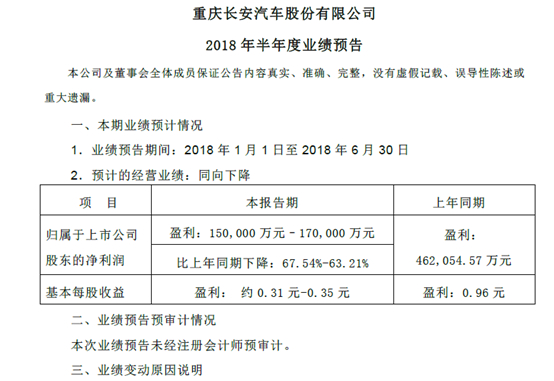 长安汽车发布上半年业绩预告 盈利大幅度下降