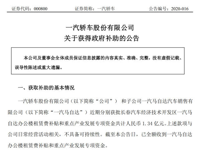 车圈|一汽轿车发布关于获得政府补助的公告 金额共计1.34亿元