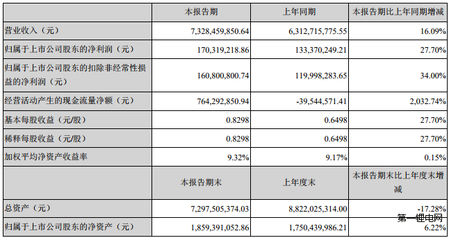 亿纬锂能发布半年报,报告期内,公司实现营业总收入25.3亿元,与上年同期相比增长34.30%,归属于母公司股东的净利润5亿元,比上年同期增长215.23%,扣除非经常性损益的净利润为4.9亿元,同比增长231.31%。 [详细]