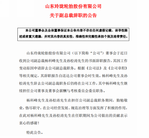 山东玲珑轮胎股份有限公司董事会发布公告称,副总裁杨科峰、孙松涛因工作变动,辞去副总裁职务。辞职后,这两个人仍然会在这家轮胎制造商工作。其中,杨科峰继续担任玲珑轮胎董事,以及董事会薪酬与考核委员会委员职务。目前,杨科峰、孙松涛的辞职报告已经生效。 [详细]