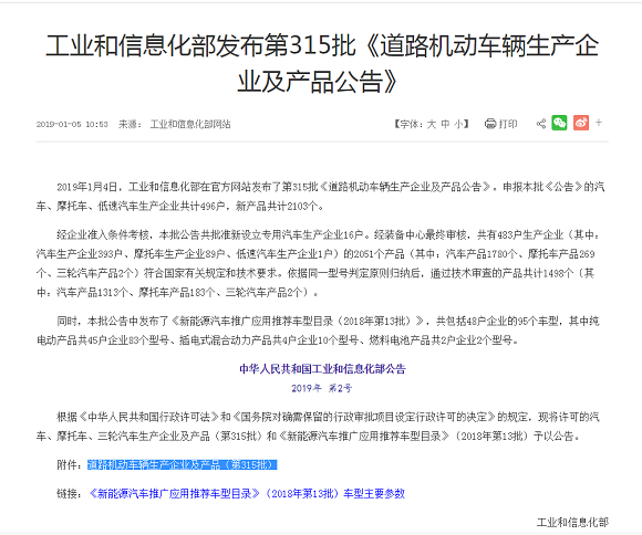 工业和信息化部发布第315批《道路机动车辆生产企业及