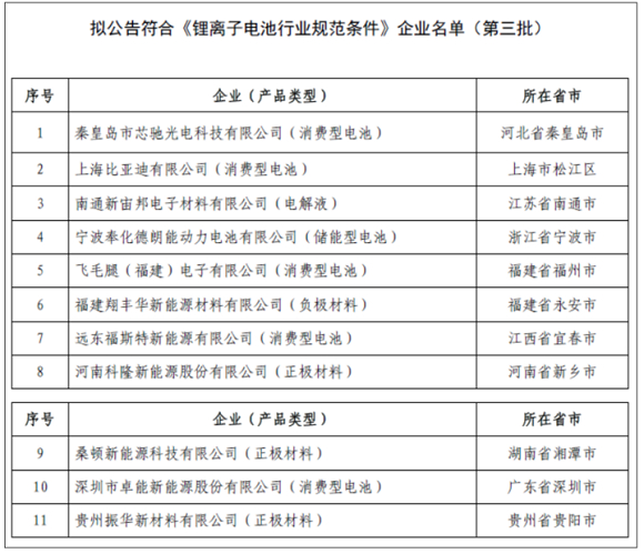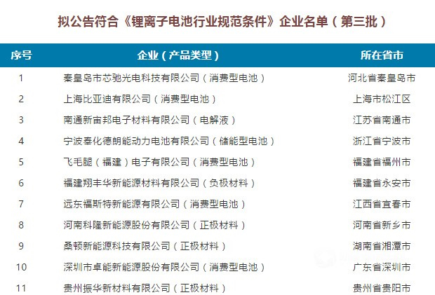 工信部公示第三批拟公告符合锂离子电池行业规范条件企