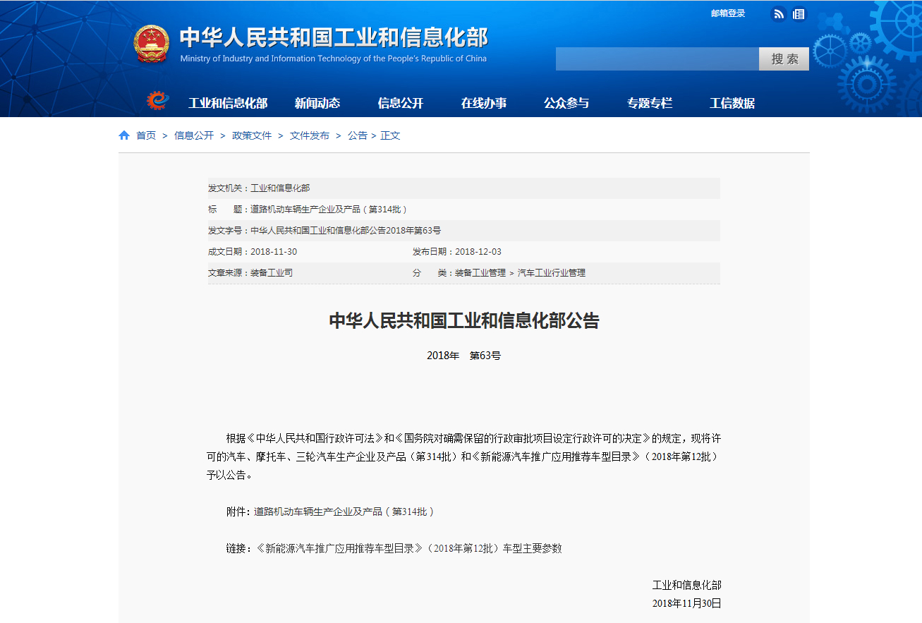 工信部发布了第314批《道路机动车辆生产企业及产品公告》。公告中同时发布了《新能源汽车推广应用推荐车型目录(2018年第12批)》,共包括66户企业的133个车型,其中纯电动产品共57户企业105个型号、插电式混合动力产品共8户企业16个型号、燃料电池产品共7户企业12个型号。 [详细]