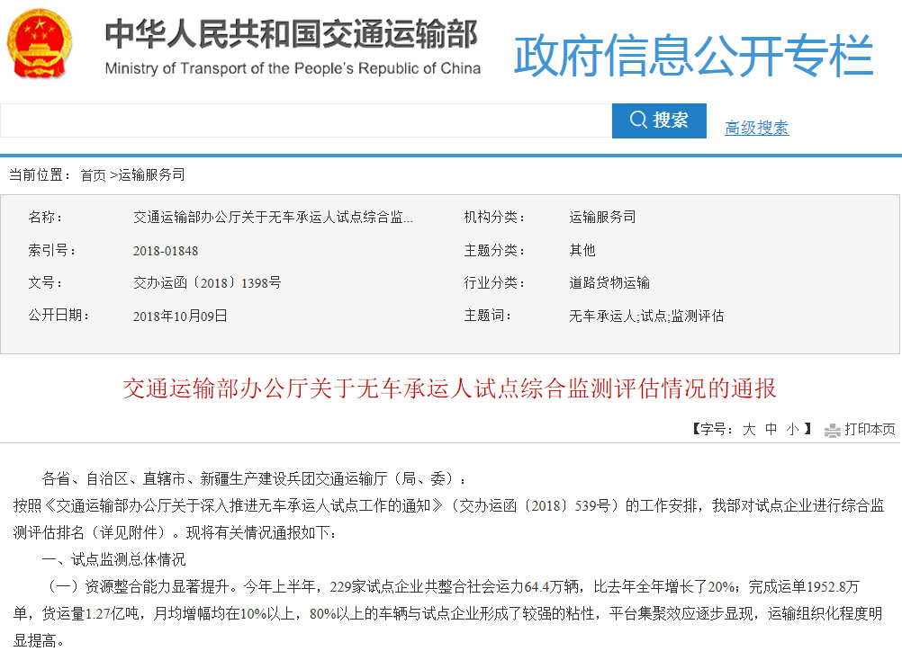 10月09日,交通运输部办公厅下发《关于无车承运人试点综合监测评估情况的通报》,对试点企业进行综合监测评估排名,并将试点监测总体情况、试点存在的问题、有关要求等相关情况做出通报。 [详细]