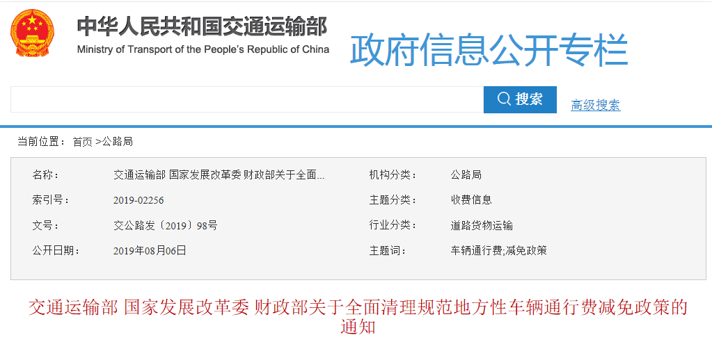 交通运输部 国家发展改革委 财政部关于全面清理规范地方性车辆通行费减免政策的通知