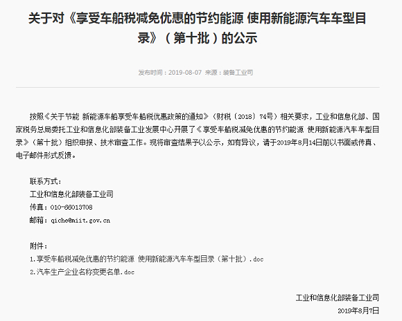 关于对《享受车船税减免优惠的节约能源 使用新能源汽车车型目录》(第十批)的公示