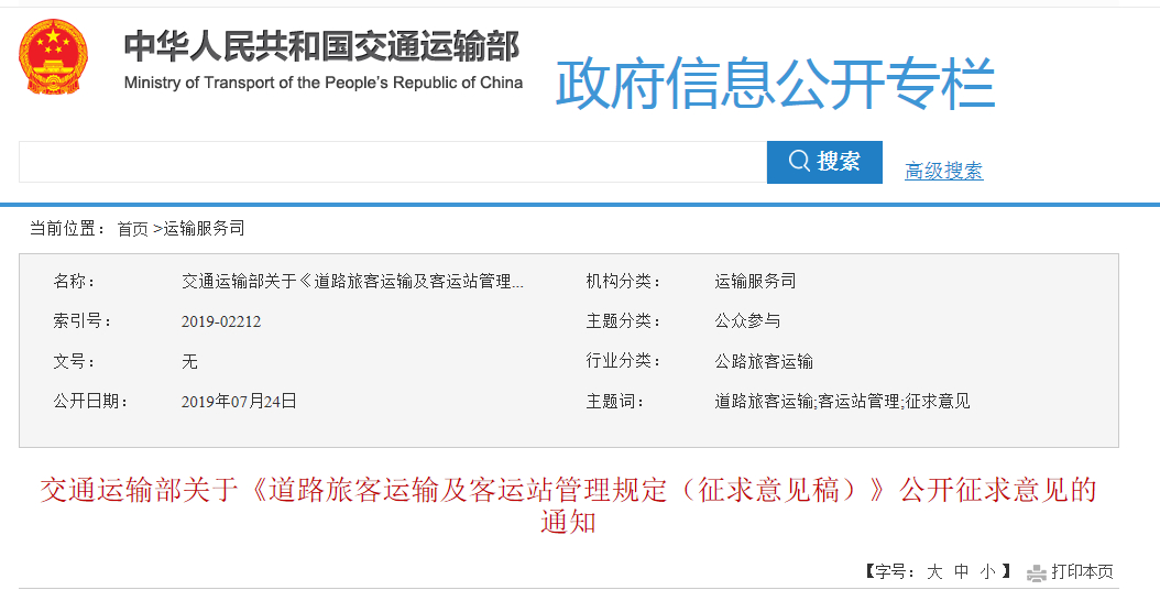 交通运输部关于《道路旅客运输及客运站管理规定(征求意见稿)》公开征求意见的通知