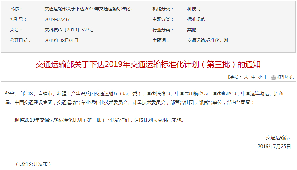 交通运输部关于下达2019年交通运输标准化计划(第三批)的通知