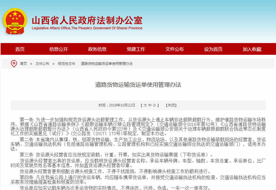 为从货运源头上遏止车辆非法超限超载行为,2018年10月23日,山西省政府法制办公布《道路货物运输货运单使用管理办法》,凡在我省公路上通行的货运车辆,均应随车携带货物运输票据(下称货运单),并接受交通运输执法机构的检查。货运单应如实记载车辆当次承运货物的实际情况, [详细]