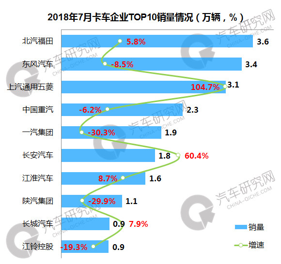 2018年7月轻卡企业:金杯汽车销量增速超过300%