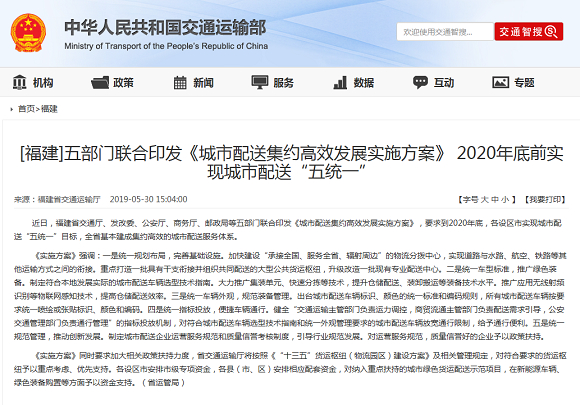 近日,福建省交通厅、发改委、公安厅、商务厅、邮政局等五部门联合印发《城市配送集约高效发展实施方案》,要求到2020年底,各设区市实现城市配送“五统一”目标,全省基本建成集约高效的城市配送服务体系。 [详细]