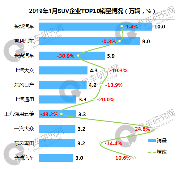 1月SUV前十企业中,长城汽车销量连续两月突破10万辆,微增1.4%;一汽大众表现突出,单月增幅24.8%;前十企业中除长城、一汽大众、奇瑞实现增长外,其他企业均出现不同程度下滑。