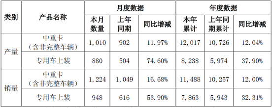 8月7日,华菱星马发布2018年7月产销快报。数据显示中重卡(含非完整车辆) 1-7月累计产量12017辆,同比增长12.04%;1-7月累计销量11488辆,同比增长12.00%。专用车上装1-7月累计产量8238辆,同比增长37.90%;1-7月累计销量7863辆,同比增长32.31%。 [详细]