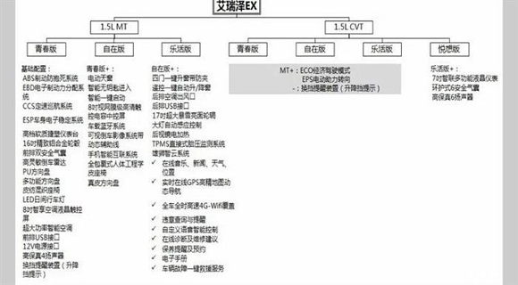 日前,汽车之家论坛曝光了奇瑞艾瑞泽EX车型的详细配置信息,新车搭载1.5L自然吸气发动机,匹配手动和CVT变速箱,共提供7款车型。