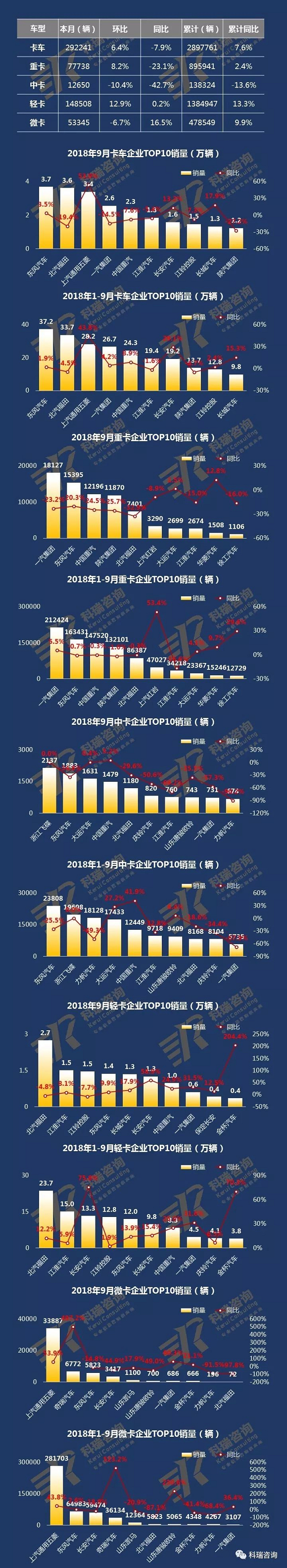•企业销量看,9月,各市场排名首位的企业分别为:卡车(东风汽车3.7万辆)、重卡(一汽集团18127辆)、中卡(浙江飞碟2137辆)、轻卡(北汽福田2.7万辆)、微卡(上汽通用五菱33887辆)。1-9月,各市场排名首位的企业分别为:卡车(东风汽车37.2万辆)、重卡(一汽集团21.24万辆)、中卡(东风汽车23808辆)、轻卡(北汽福田23.7万辆)、微卡(上汽通用五菱281703辆)。