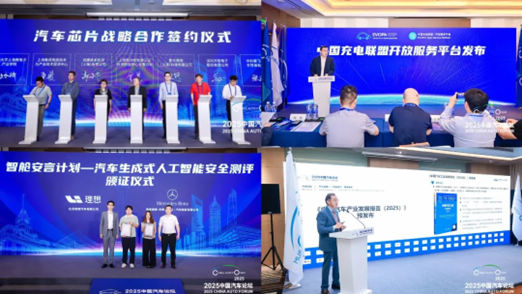 作为论坛的重要特色和亮点之一,2025中国汽车论坛同期了举行10多项重磅行业发布活动。各场主题论坛分别进行了“中国汽车”大品牌形象建设报告研究项目启动、《2024-2025中国汽车行业可持续发展报告》发布、2025中国汽车行业可持续发展实践案例发布、《中国汽车行业技能人才发展报告》发布、中国汽车工业协会A级培训中心授牌仪式、“醇氢电动生态联盟”成立仪式、《中国商用汽车产业发展报告(2025)》发布、基于智慧路口对抗交通流的合成数据集发布、安亭镇-上海汽检合作签约仪式、上海汽检-同济大学软件学院共建实验室签约仪式、汽车芯片合作签约仪式、智舱安言计划-汽车生成式人工智能安全测评颁证仪式、中国充电联盟开放服务平台发布以及《中国汽车工业发展报告(2025)》预发布。