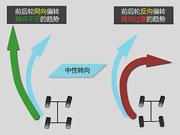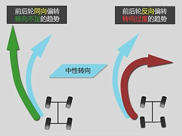 车辆在弯中的实际转向角度比前轮的转动角度小。
