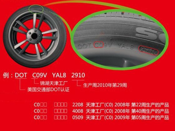 用一组数字及字母标志,表示轮胎的制造年月及数量。它共有四位数字“AABB”组成。前两位“AA”表示一年中的第几周,后两位“BB”表示年份。