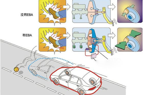 3技术原理 刹车辅助一般称为EBA或BAS等。传感器通过分辨驾驶员踩踏板的情况,识别并判断是否引入紧急刹车程序。由此该系统能立刻激发最大的刹车压力,以达到可能的最高的刹车效果。它与防抱死刹车系统(ABS)配合。ABS能缩短刹车距离,并能防止车辆在刹车时失控,从而减少了事故发生的可能性。但是在紧急制动的情况下驾驶员往往由于制动不够果断或踩踏力不足而无法快速触发ABS浪费了制动时间,从而达不到预期的效果。为此,汽车工程师们设计了刹车辅助,即让现有的ABS具有一定的智能,当踩刹车时动作快、力量大时,BAS就判断驾驶者在紧急刹车并让ABS工作,迅速增大制动力。