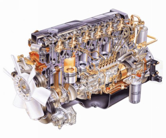 通过燃烧气缸内的柴油产生动能,带动连在活塞上的曲柄连杆机构,围绕曲轴做往复的圆周运动而输出动力、