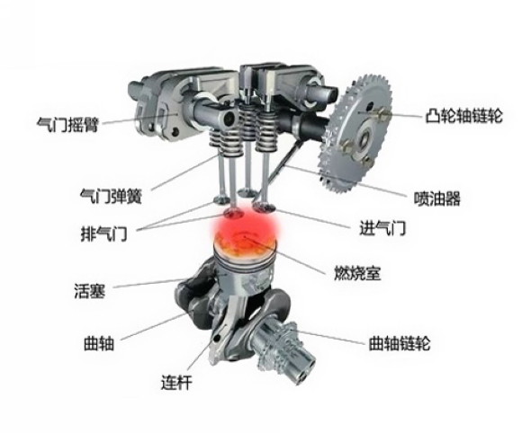此时,进排气门同时关闭,气缸内的温度、压力急剧上升,此时缸内温度远远高于柴油的燃点,喷油嘴向气缸内喷入燃油,在高温、高压的情况下柴油与空气混合并立即自行燃烧,推动活塞向下移动,通过连杆带动曲轴旋转。