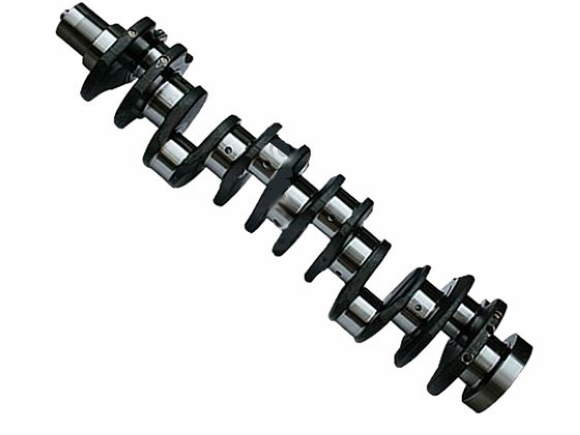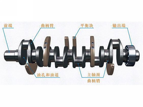 发动机的主要旋转机件,装上连杆后,可承接连杆的上下(往复)运动变成循环(旋转)运动。由碳素结构钢或球墨铸铁制成的,有两个重要部位:主轴颈,连杆颈。主轴颈被安装在缸体上,连杆颈与连杆大头孔连接,连杆小头孔与汽缸活塞连接,是一个典型的曲柄滑块机构。曲轴的润滑主要是指与连杆大头轴瓦与曲轴连杆颈的润滑和两头固定点的润滑. 曲轴的旋转是发动机的动力源。也是整个机械系统的源动力。